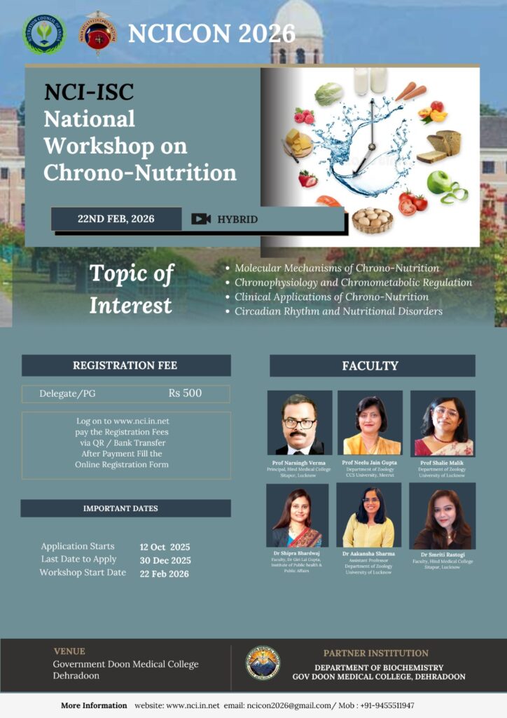 Biochemistry Department is organizing under organizing secretary Prof. (Dr.) Rajeev Singh Kushwaha, a National Level conference on Nutrition “NCICON 2026” on 21, 22 Feb 2026 in Collaboration with Nutritional Council of India.